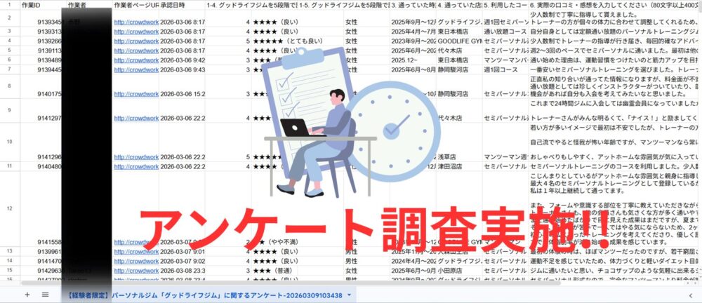 当サイトでは「クラウドワークス」にてグッドライフジムの利用者体験談のアンケートをとりました。