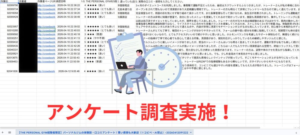 当サイトでは「クラウドワークス」にてTHE PERSONAL GYMの利用者体験談のアンケートをとりました。